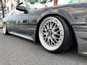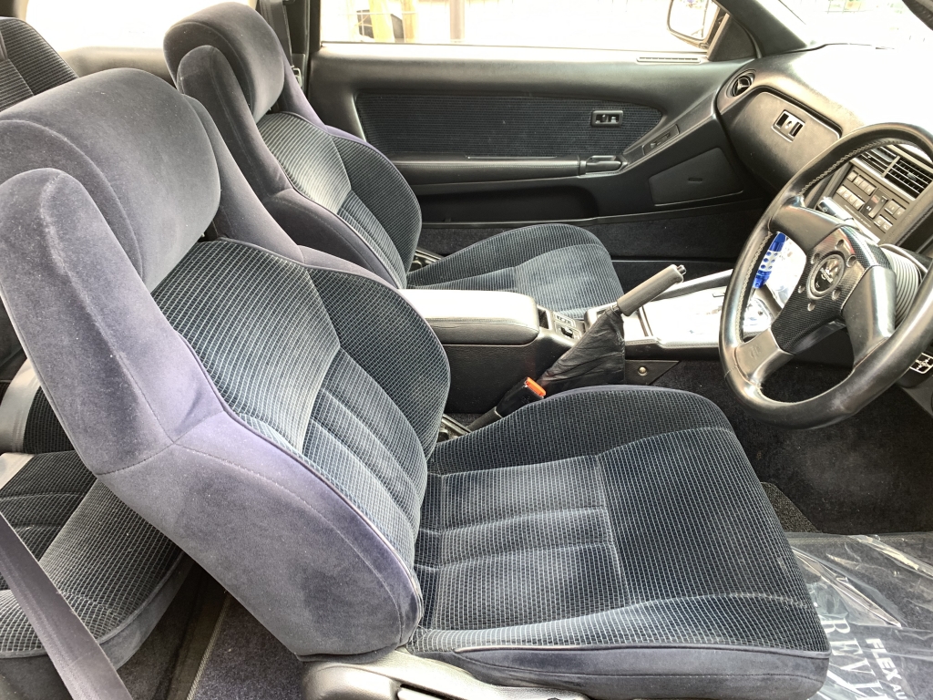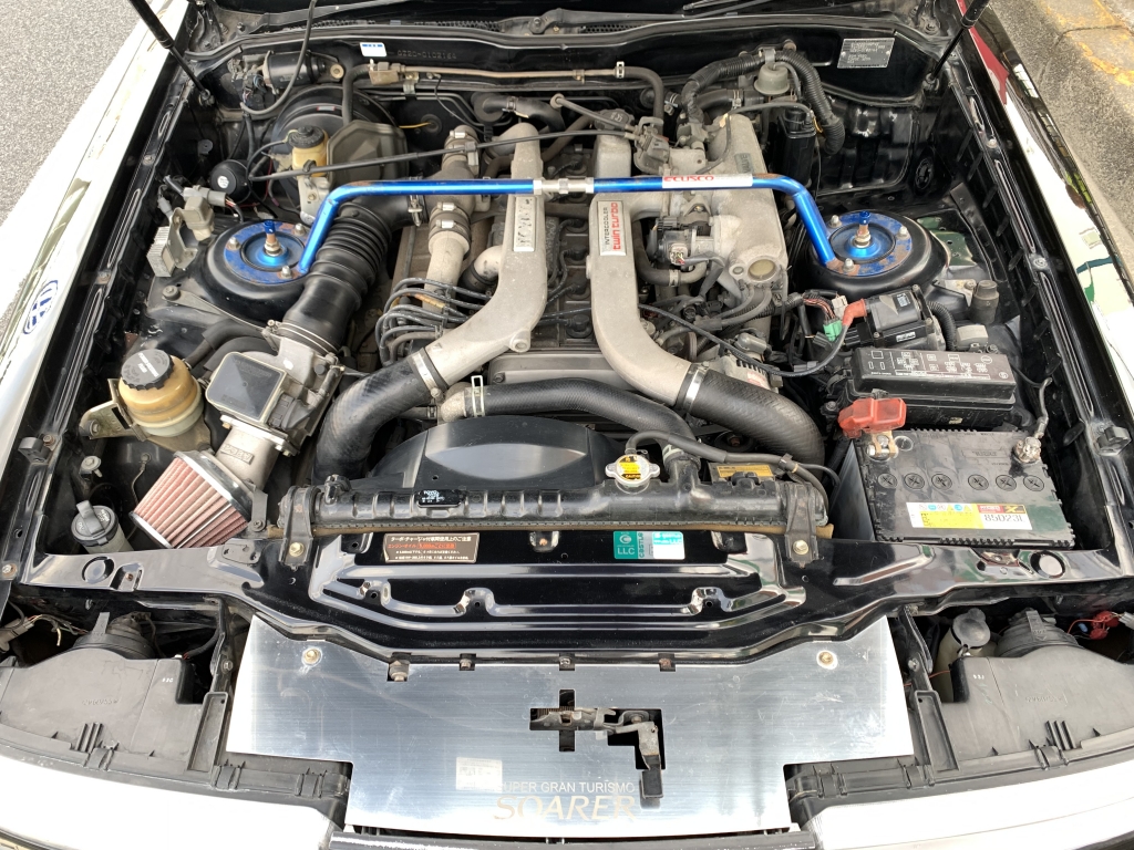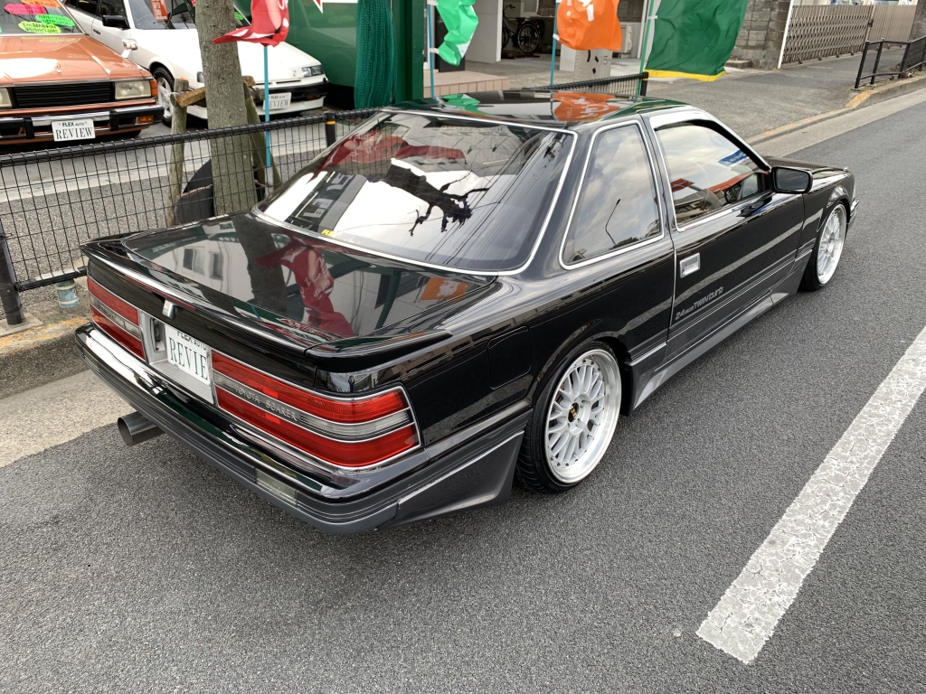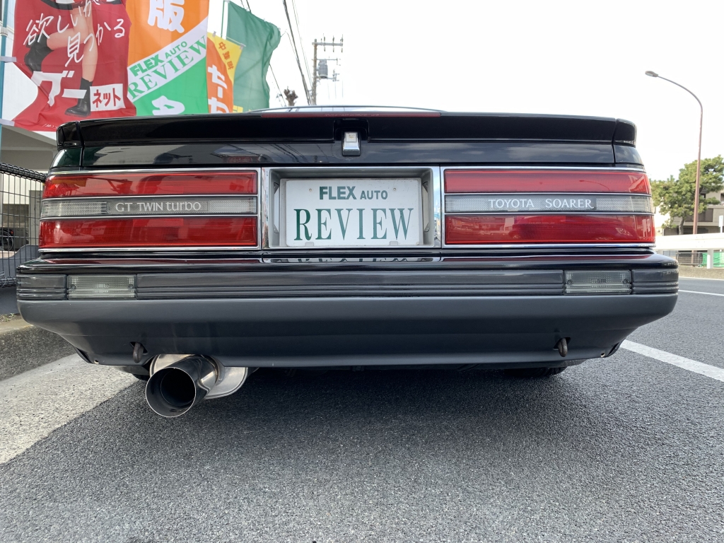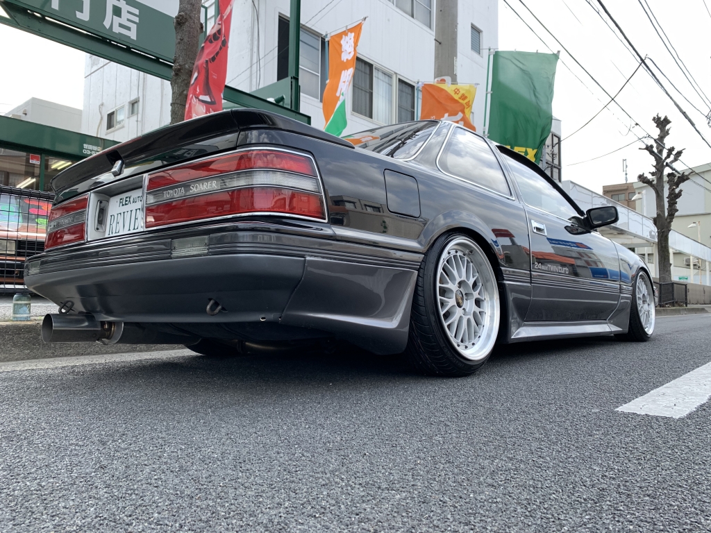 ついに登場!黒銀ツートンの20ソアラGTツインターボ!黒銀ツートンの元からあるイカツさを活かしたシンプル街乗り仕様に仕上げてみました!自分で仕上げておきながら自分で欲しくなるパターンです。超絶にかっこよすぎて、刺激的すぎてたまりません!!しかもコンディションも良いベース車両ということもあり、美味しいポイントだらけ♪20ソアラはノーマルでもカッコイイんですけど、お金をかけなくてもビシッと決めたいときにはこういった仕様が近道です。足元は車の生命線とも言えるくらい大事ですからね。どうせアルミホイールを変えるならここまでやったら良いと思います!BBS-LMは前8J後ろ9Jにオフセットとタイヤサイズは拘って履かせています。車高もギリギリまで下げて全体のバランスも良くなりました♪前後フルタップ車高調なのでこの車高でも乗り心地良く快適に走ることができます!フェンダーも前後とも加工しないで絶妙なツライチでタイヤも交わしています。純正フルエアロにサンルーフ、黒銀ツートンでこの仕様は何気に少ないし、無敵です。外装は小傷が残っている箇所はありますが、塗装面のツヤがあるので印象は良いです!室内はケチのつけようが無いほどキレイな状態を保っています!お得意のダッシュボードと内張りの傷みもほとんど無く、純正シートも日焼けの色飛びも少ないしキレイなんです!サンルーフとエアコンも稼働確認済み。オールシーズン気持ちよく乗れますね♪実走行は6.5万㎞、機関も調子が良いもんで不安なく走れますね!柿本マフラーで音量も程良い感じ!中間が太くて腹下が気になって走れないということであれば、マフラーはワンオフをオススメしますよ!ボディ状態の腹下はそこそこ稼げているので、あとは走り慣れが必要です!5速ミッションも人気はありますが、20ソアラはATでオトナチックに走るのも良いんですよ♪今となっては20ソアラもどんどん価格が高騰していますので、手に入れるチャンスは今が一番良いですよ!スーパーホワイトかパールツートンなどハイソカーたる明るい色が主流で人気は高いのですが、私の中ではこの黒銀ツートンが一番シブいと思っていますので。毎度早い者勝ちです!本気でお探しの方は迷わずお問合せください!