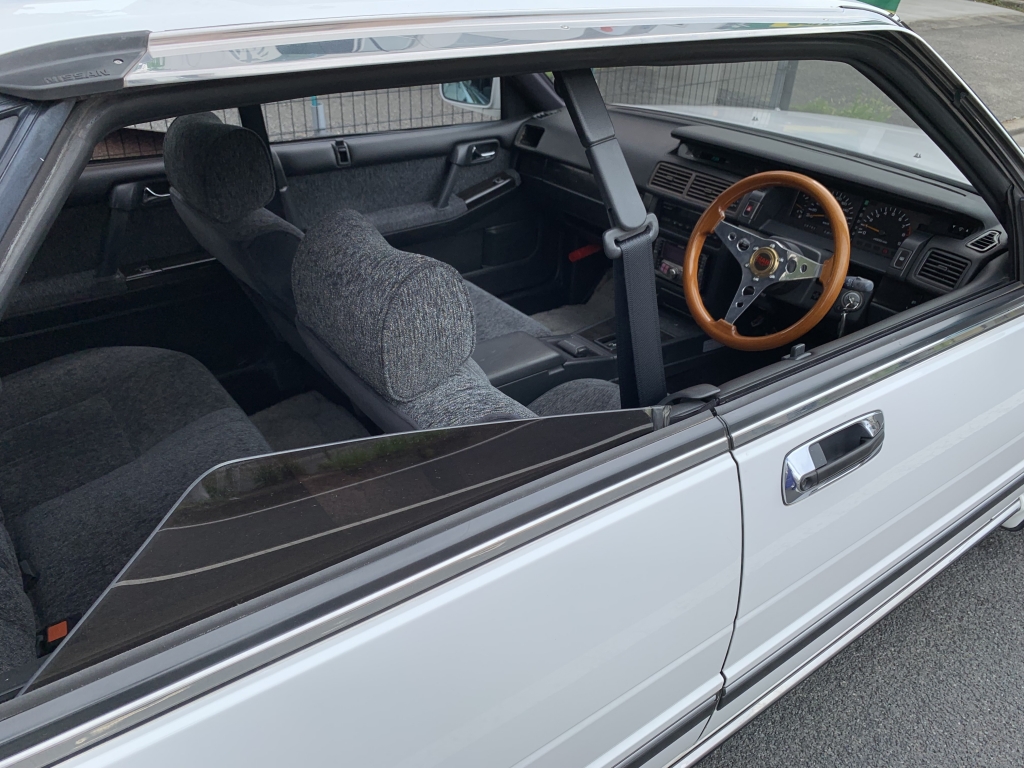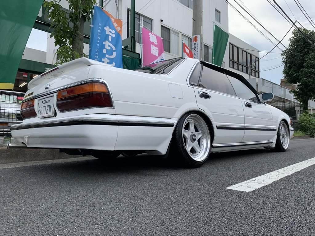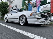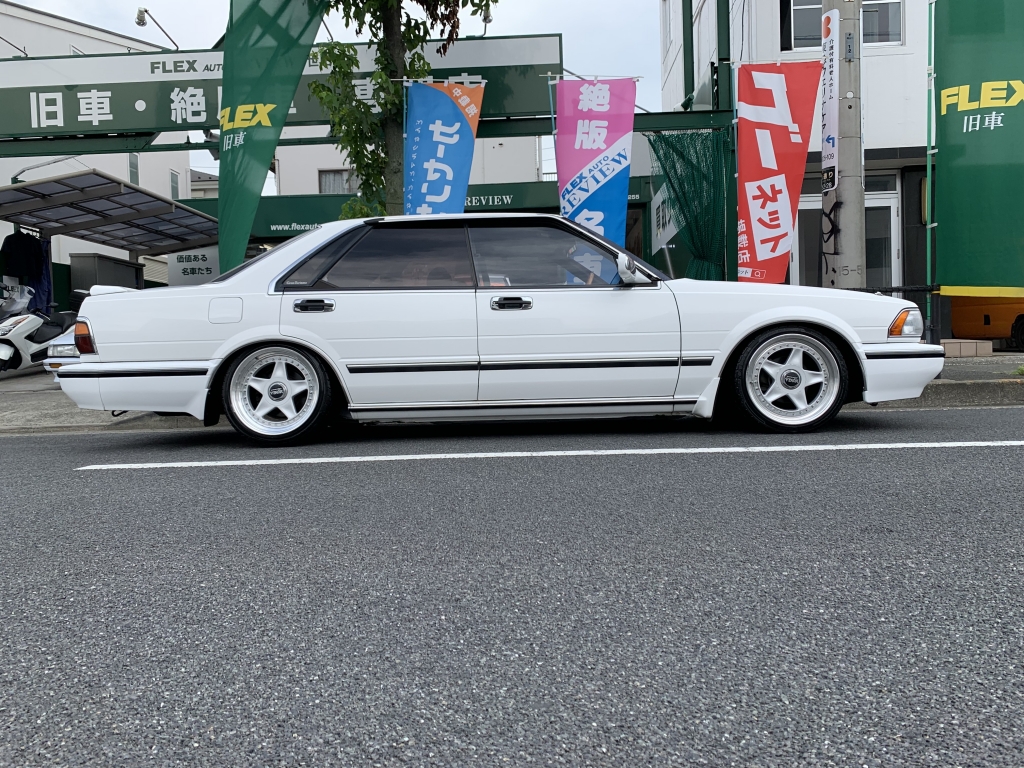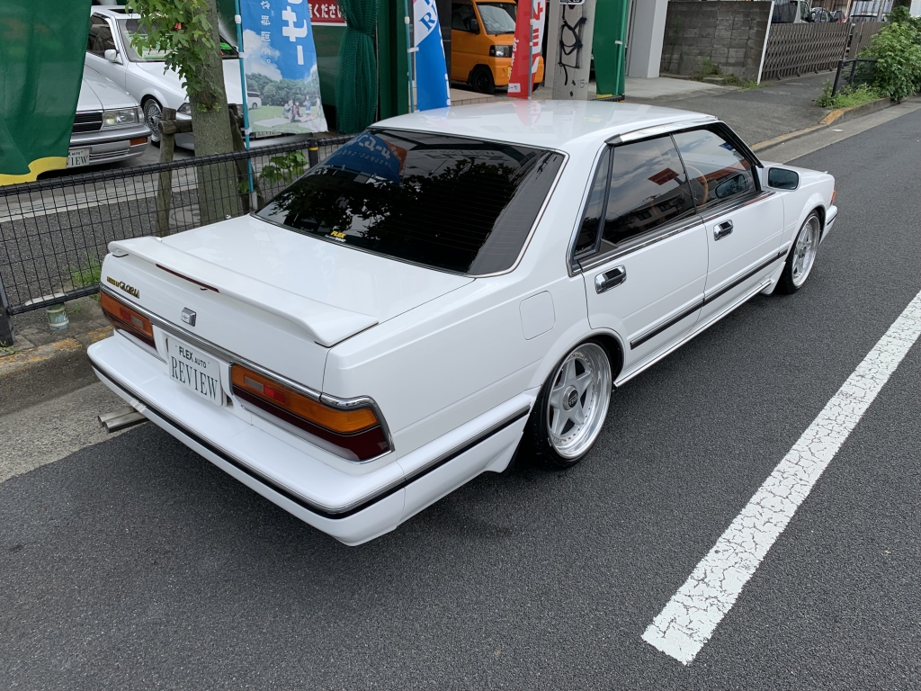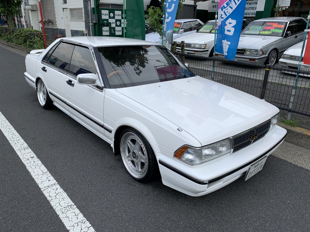 Y31グロリア後期のグランツーリスモSVは久しぶりの入庫ですね!超カッコイイですよこのグロリア!グランツに3Lバンパーを付けたさりげない贅沢な仕様です。スポーティさとワルさを兼ね備えたピラーレスハードトップの高級車はやはりY31グロリア!現車を目の前にするとさすがに欲しくてたまらないですね。自分で乗りたいですよ本当に。あまり大きなカスタムをしていないのに、こんなにクールにキマッてしまうのはさすが当時の日産車です。ホイールは希少なMONZAスピードの8J9を履かせてエスペリアのローダウンサスで車高を下げて、マフラーはワンオフでテールがデュアル、これだけで抜群の雰囲気を演出できているのが素晴らしい!グランツSVで5本スポークのホイールというのがセンスが光ります。なによりも記録簿が新車時から多数残っているというのもナイスです。大事に乗られてきたんだなというのはこのコンディションを見れば一目瞭然ですよ。ボディの状態は文句無し、塗装面もしっかりツヤが残っているし気になるようなサビもありません。個人的には3Lバンパーの恩恵が強すぎて外観は何も言うことはありませんね。ワンオフマフラーでVG特有のドロドロしたヤミツキになるサウンドも良いし、何気にブレーキフラッシャーも付いていて遊び心は満点!室内もキレイに保たれているので清潔感があります。変なタバコ臭さとかもありません!ダッシュボード、シートや内張りなども目立つような傷みが無くて好印象ですね♪ピラーレスハードトップの解放感もしっかり味わってくださいよ!エアコンも実動でオールシーズン快適です。機関はもちろん良好です!実走行は6.8万㎞でエンジンは元気だしまだまだ走れます!通勤で乗ってもらいたいくらい。このグロリアで街中バンバン走っていたら超カッコイイですよ♪誰もが注目します!長旅快適クルージングも良いと思います!このグロリアに乗ってハチマルミーティングにでも行きましょう♪現車確認も大歓迎ですけど、とにかく早い者勝ちですよ!