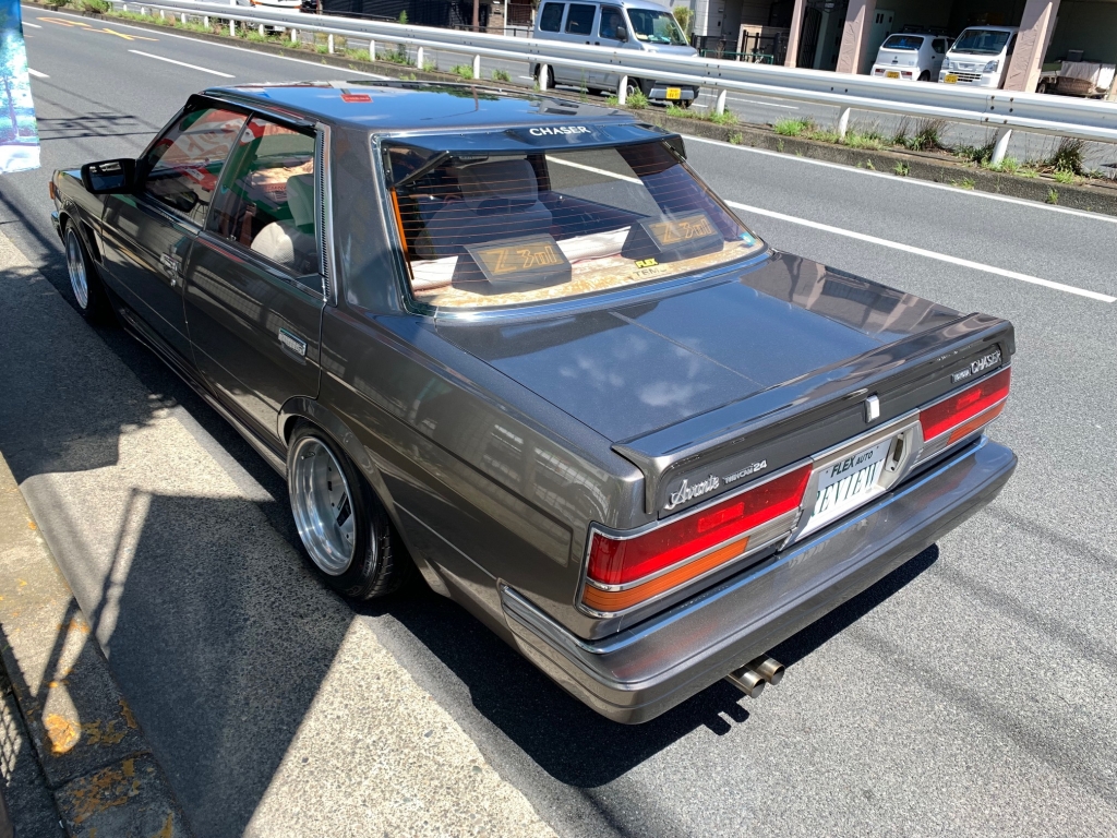 これくらいにしっかりカスタムされた71チェイサーは久しぶりの入庫ですね!これ現車かなりカッコイイですよ!専門ショップにてしっかりと手入れされてきているので間違いありません。ここまでお金がかかっていて、しかも車検も超ロング、これはお得すぎますね!ガンメタに塗装されたボディもスポーティなチェイサーにはピッタリすぎるくらいに似合っています♪フロントの車高調はリアショックは専門ショップオリジナルのワンオフ物です!乗り心地が固すぎず程良い感じで長距離運転も疲れません!マフラーもフルステンレスのワンオフでタケツボタコ足との相性も抜群の素晴らしいサウンドです。吹け上がりが良いので高回転まで踏むのが気持ちよすぎます!エンジンも調子が良いのでまだまだ乗れますね♪タイベルは交換済みです。クーラーはR134のレトロフィット化で現状もしっかり冷えています。ガス補充になっても安く済みますね!実際に試乗してみましたが、シャコタンだけどかなり運転しやすいです。エンジン上げもしてあるしマフラーは腹下ビタビタに作られているのも要因!これは私も欲しくなりましたね、調子も良いし程度も抜群に良いし安心して走れるので♪オプションのシートレースカバー、リアバイザー、リアスポもポイントが高いです!超希少ですからねチェイサーのオプション品は!毎度早い者勝ちですので、本気で取り掛からないともったいないですよ!現車確認も大歓迎です。お問合せください!