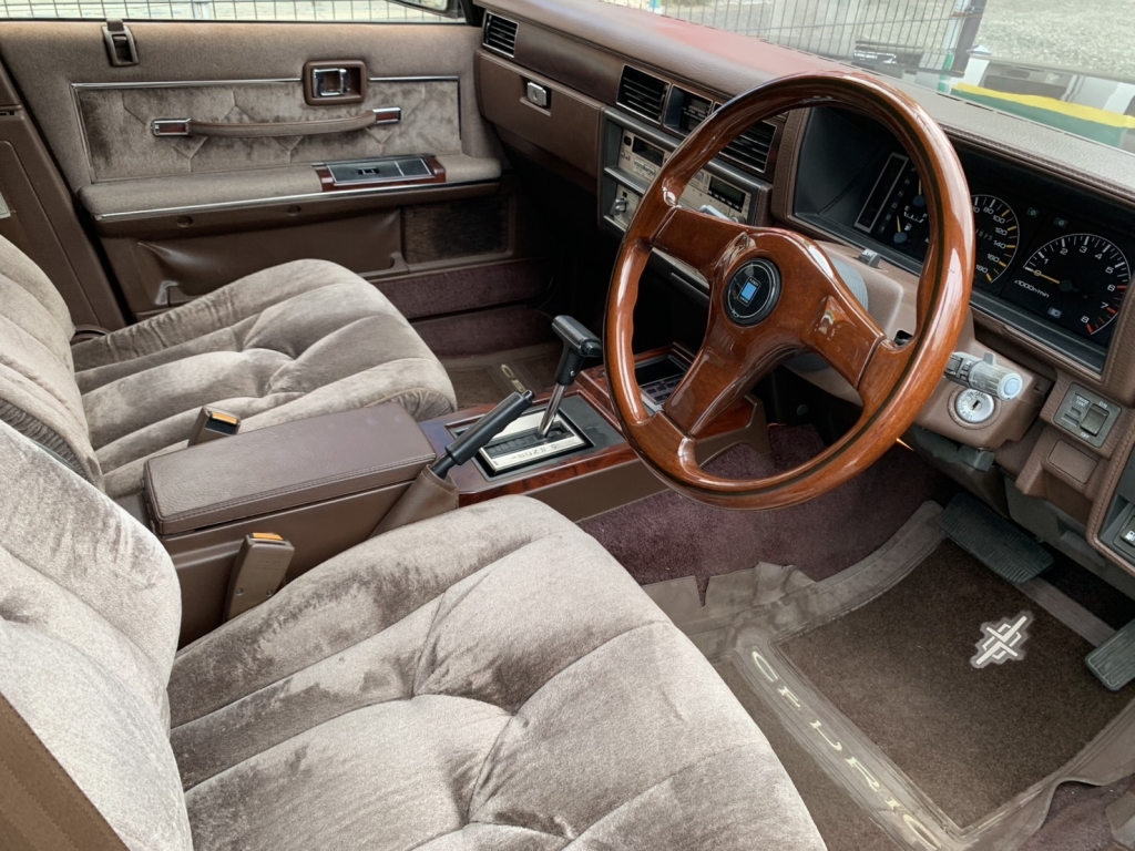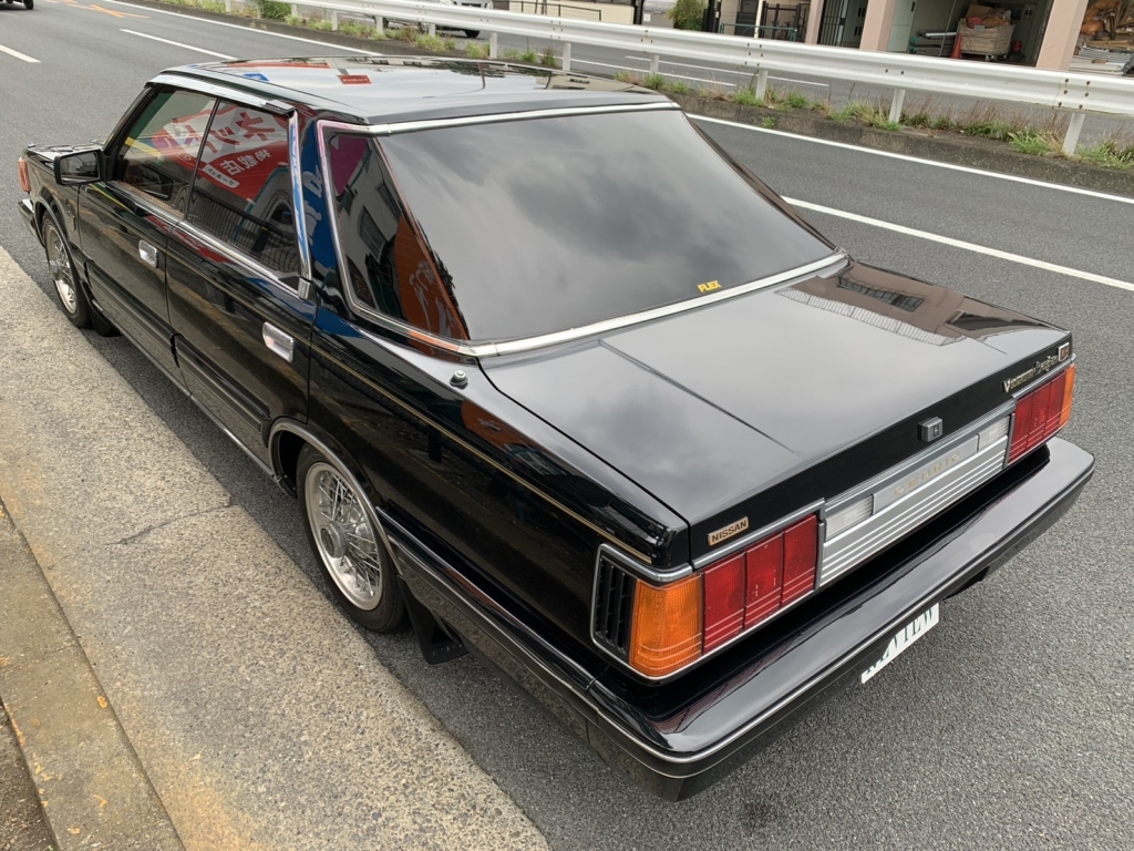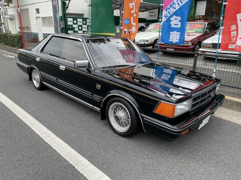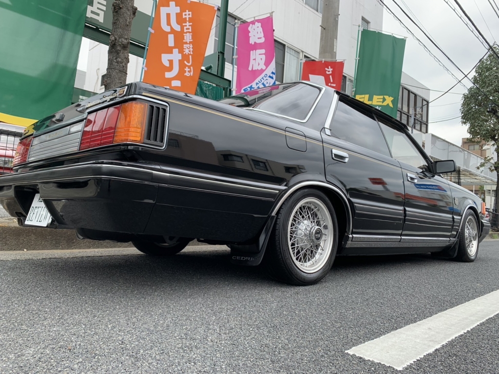 Y30セドリック前期のブロアムVIPターボなんてここ何年も入庫していません。しかもこんなに良い状態で残っているなんて驚きです。前後ブレーキキャリパーはOH済みでフルタップ車高調も入っています。ちゃんと手を入れているのはとてもナイスですよね。黒に当時物フォルテクスワイヤー履いてシャコタンというド定番なスタイルですがこれが激シブなわけです!すごいですよね当時の日産車、とくにこのY30あたりは。ノーマル外観で伸びしろがありすぎるから、そりゃあもうこのカッコよさになります。探している方も多いでしょうけど私もめちゃくちゃ欲しいです。Y30の良さはガッチリ知ってしまっていますから!街中で見かけたらより一層シビれますよ。購入してから1年~2年後とか、手に入れて良かったなと思えるはずです!ちょっと今回はプライス張ってしまいますけど、それなりに楽しめるセドリックだということは間違いありません。キレイな外装、内装、ボディコンディションもサビ少なく良好、エンジンも絶好調で力強い加速します♪エアコンは今のところリア側がちょっと冷え弱いけど実働です。ガスチャージしてどうなるかですね。室内は気になる傷みは無くキレイです。高級感のあるブロアム内装はキレイでないとね!冷やかしではなく本気でお探しの方は今回のチャンスをお見逃しなく!お問合せをお待ちしております。
